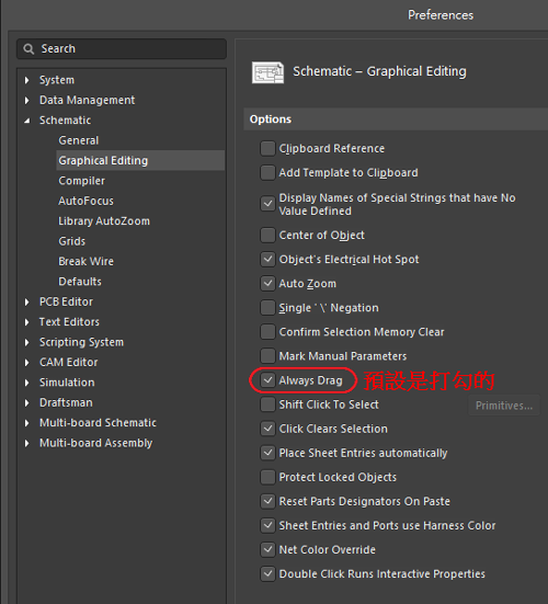 Always Drag啟用與非啟用狀態,翻轉零件的快速鍵不同。