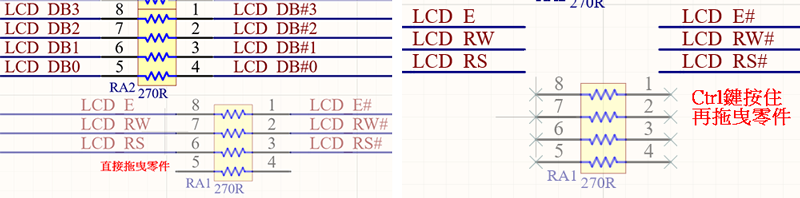 2. 抓取零件直接拖曳即可連同Wires線一起移動,若只想單獨移動零件,Ctrl鍵按住再拖曳零件。
