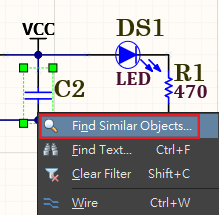 Find Similar Objects對話框提供了多種搜尋條件,在搜尋的過程中,將該目標物件屬性相同的特徵作為參考。篩選、搜尋和選取物件可以一次達成,將Find Similar Objects流程與Properties面板結合使用時,你可以同時編輯多個相同物件,不僅可以編輯當下電路,還可以編輯專案中所有電路。
