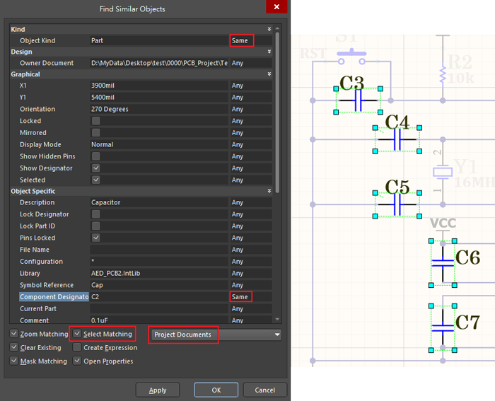 2. 跳出一個對話框,針對相同屬性設為Same,Select Matching記得勾選才會將相同條件的物件選取,下拉選單選擇Project Documents才會將專案中底下所有電路列為搜尋範圍。