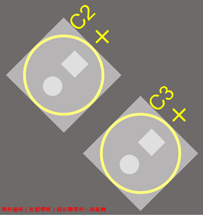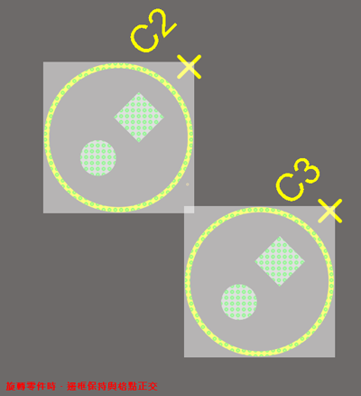 當零件旋轉時,由於邊框不旋轉(保持與格點正交),通常會導致零件間距碰撞,並且在靠近較大或旋轉的零件時,難以選擇到較小零件。