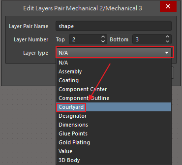 針對層別Name、Number可自行設定,Layer Type選擇Courtyard